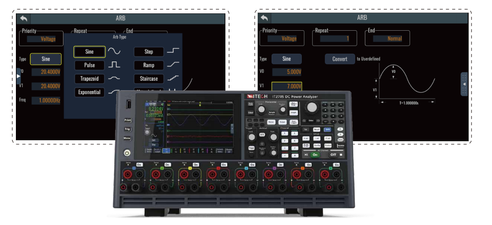 IT271XX/IT273XX/IT275XX/IT278XX 模組皆配備高效能任意波形(ARB)輸出功能,支援使用者自訂電壓、電流、功率或阻 值隨時間變化的輸出序列,可精確類比 DUT 輸入端的電壓瞬變、幹擾跌落、負載脈衝等動態工況。